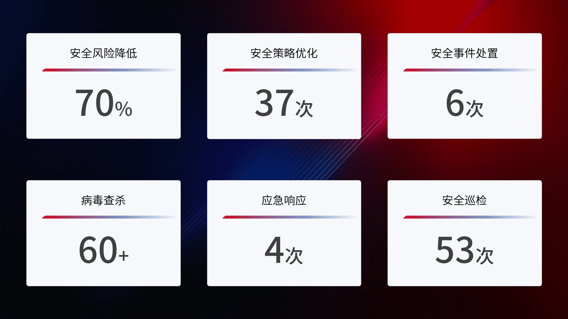 提供全面的安全事件报告体系,,,包括处置报告、、、、周报、、、、季度和年度总结,,,,结合持续监控,,,帮助客户深入了解网络安全状况。。